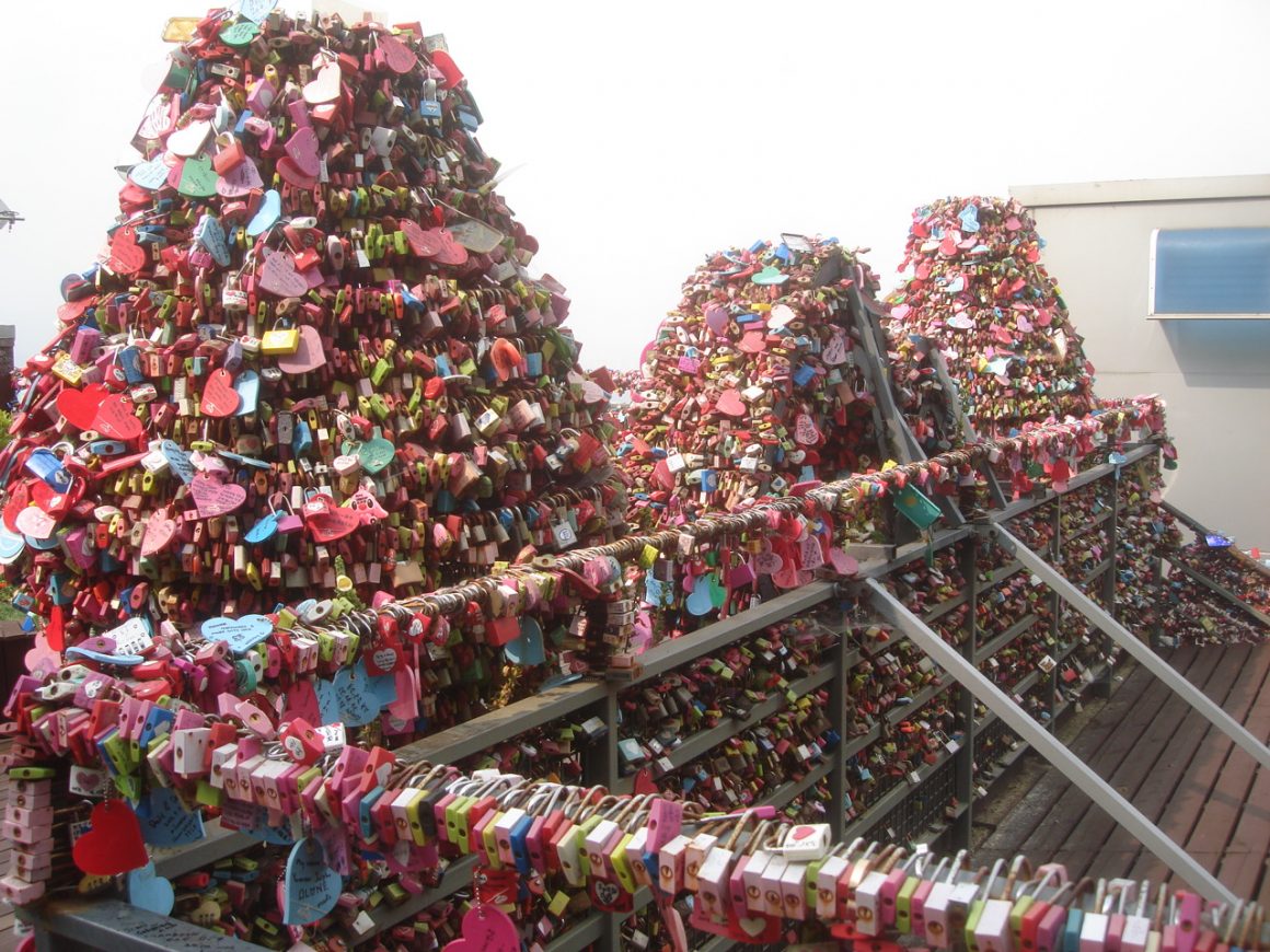 عشرات الآلاف من الأقفال الحديدية والبلاسيتيكية والخشبية المزينة بكلمات وأشعار بمختلف اللغات عن الحب والعشق، تلك الأقفال تراها معلقة على أسوار حديقة نامسان بوسط العاصمة الكورية الجنوبية «سيول»، ليس هذا فحسب بل تجد العشاق صمموا من تلك الأقفال أشكال من شجار الكريسماس وقلوب حديدية كبيرة.