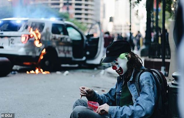 اتهم مكتب التحقيقات الفيدرالي مثيرًا للشغب، يرتدي قناع شخصية «الجوكر» الخيالية، بإشعال النار في سيارة شرطة.