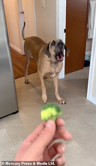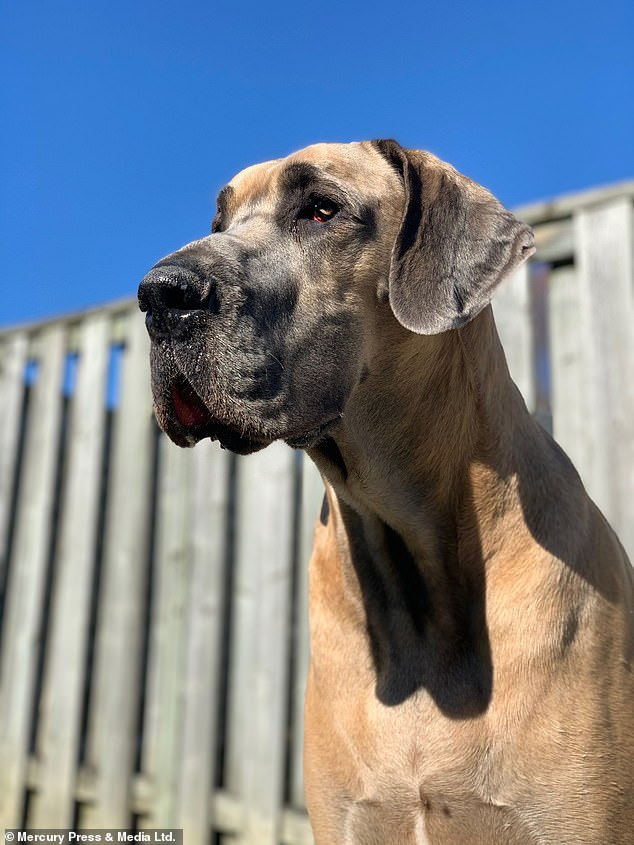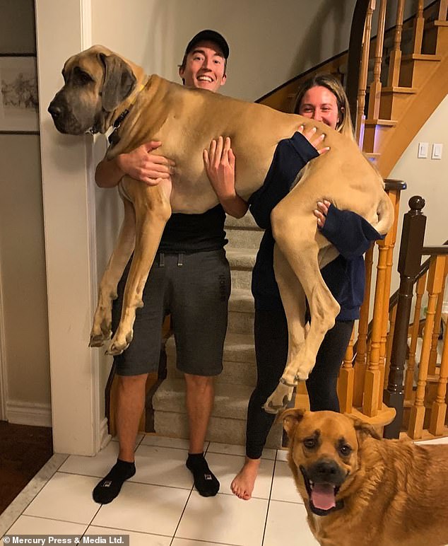 وتبنى الزوجان الكلب حينما كان عمره 7 أسابيع فقط، لكن رغم حجمه الضخم، يهرب من الحيوانات الصغيرة والخضروات، وحتى قطع البلاستيك.