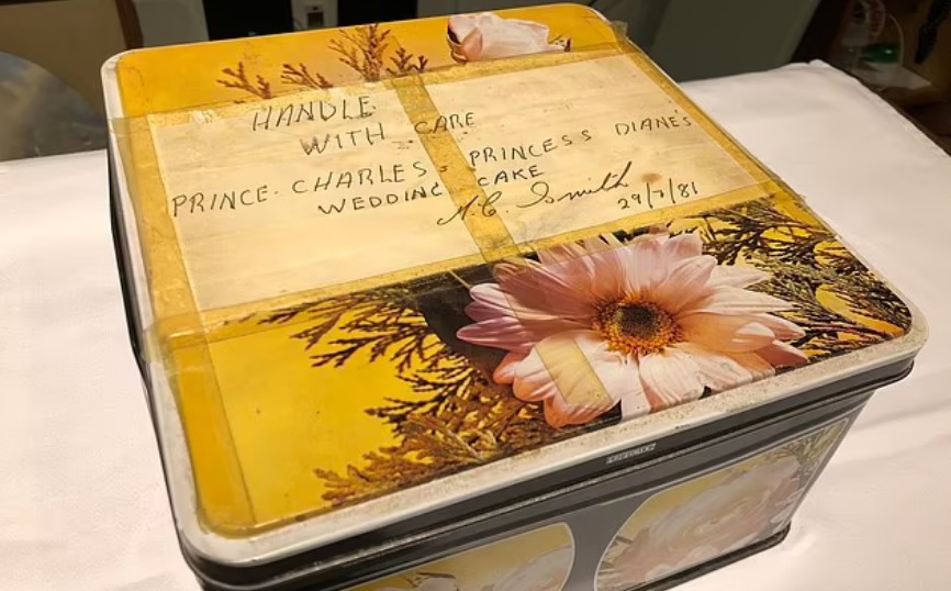 واحتفظت «مويا» بالكعكة في علبة زهرية قديمة، ووضعت ملصقًا يدويًا على الغطاء، مكتوب عليه: «تعامل بعناية. كعكة زفاف الأمير تشارلز والأميرة ديانا»، وهي موقعة ومؤرخة في 29/7/1981.