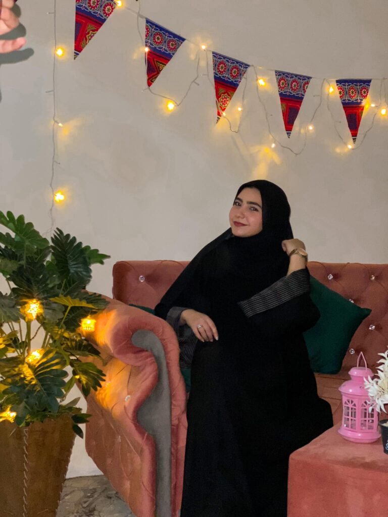 تقول: «فى الصلاة حبيت تكون العباية سادة عليها نقشة خفيفة، والإسدال يبقى سادة ماليزى أفضل من المنقوش، إنما فى الخروجات بعد الفطار الفساتين تكون فيها نقشات رمضانية، وأفضل لون عجبنى الأزرق والنقشة بيضا».