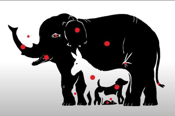 تبرز بعض الحيوانات في الصورة مثل الفيل، والحمار، والكلب، والقطة والفأر، والتي يمكن لغالبية الأشخاص العثور عليها بسهولة.