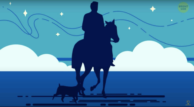 تُظهر الصورة رجلًا يمتطي حصانًا وكلب عند قدميه، لكن تحديد شخصيتك يتوقف على الاتجاه الذي يسير فيه الحصان.