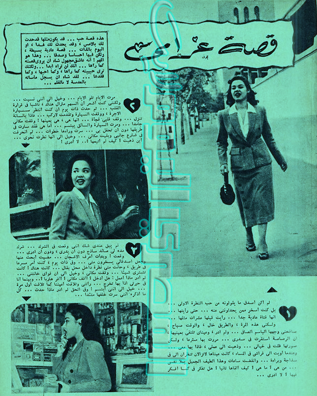 حملت مجلة «الاثنين والدنيا» بتاريخ 7 يوليو عام 1952، بين صفحاتها الثامنة والتاسعة والعاشرة على التوالى قصة حب مصورة تحمل عنوانًا «قصة غرامى»، وجاء العرض كالآتى: