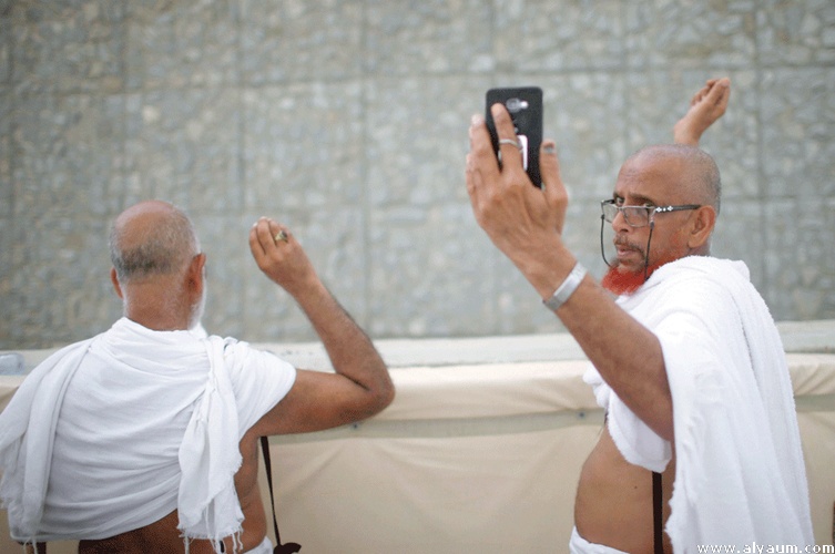وهناك حاج آخر يصوّر نفسه وهو يرمي الجمرات.