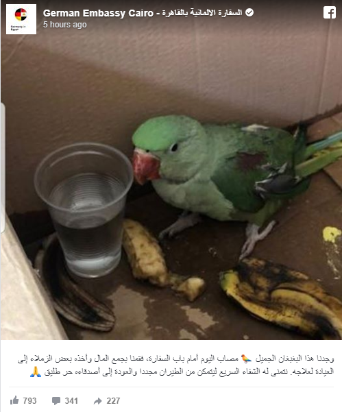 وجاء في بيان السفارة، عبر موقع «فيسبوك»: «وجدنا هذا البغبغان الجميل مصاب اليوم أمام باب السفارة، فقمنا بجمع المال وأخذه بعض الزملاء إلى العيادة لعلاجه».