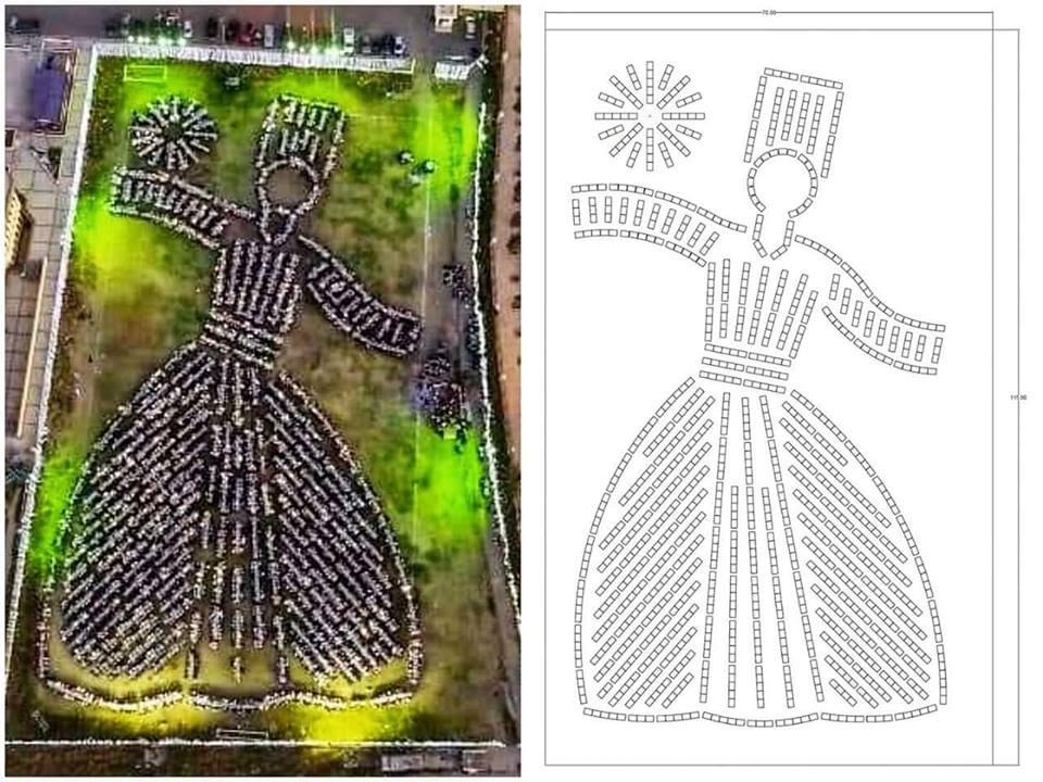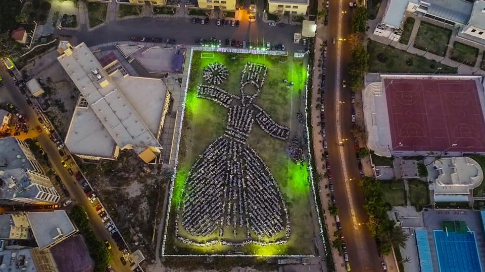 والشكل النهائي هو نتاج تخطيط بدأ بحصر عدد الحضور، ثم تجميع مقترحات من 250 طالب شاركوا في تنظيم الفعالية وفق قول «راشد»، والذي يشير إلى أنه يتم الاتفاق على تصميم بعينه، ومن ثم يشرعون في العمل به عن طريق برنامج الرسم الهندسي «أوتوكاد»، وذلك على مساحة ملعب كرة القدم الذي يسع 22 لاعبًا.