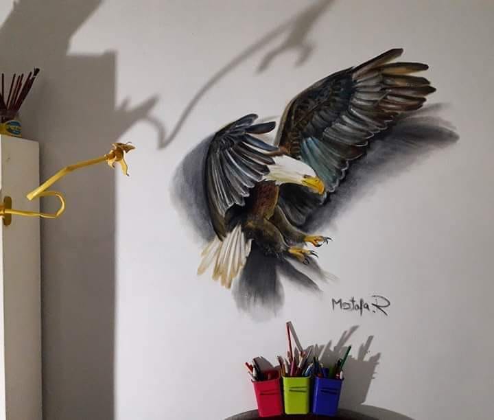 بهذه المعطيات احترف الشاب مصطفى راغب رسم الخدع البصرية أو الـ3D، فعادةً ما يخرج بأشكاله من حدود الورق إلى جدران المنزل، مستغلًا في ذلك عمله كمصمم ديكور.