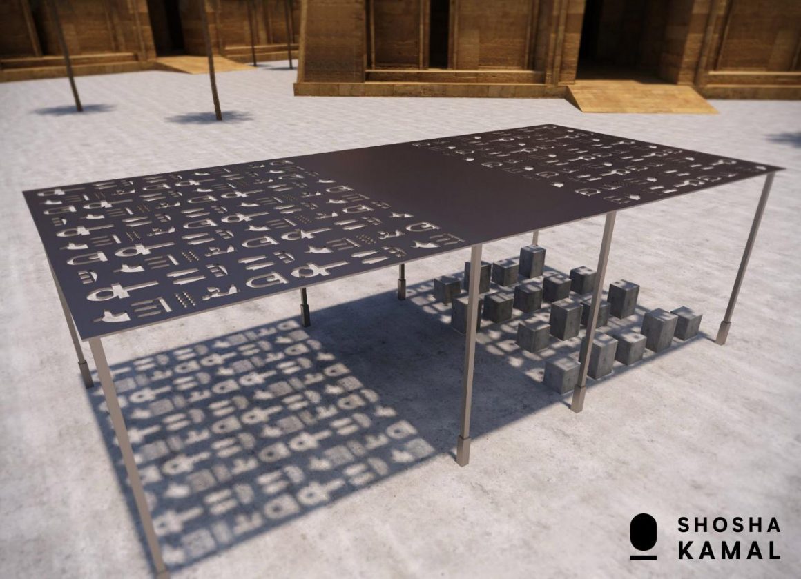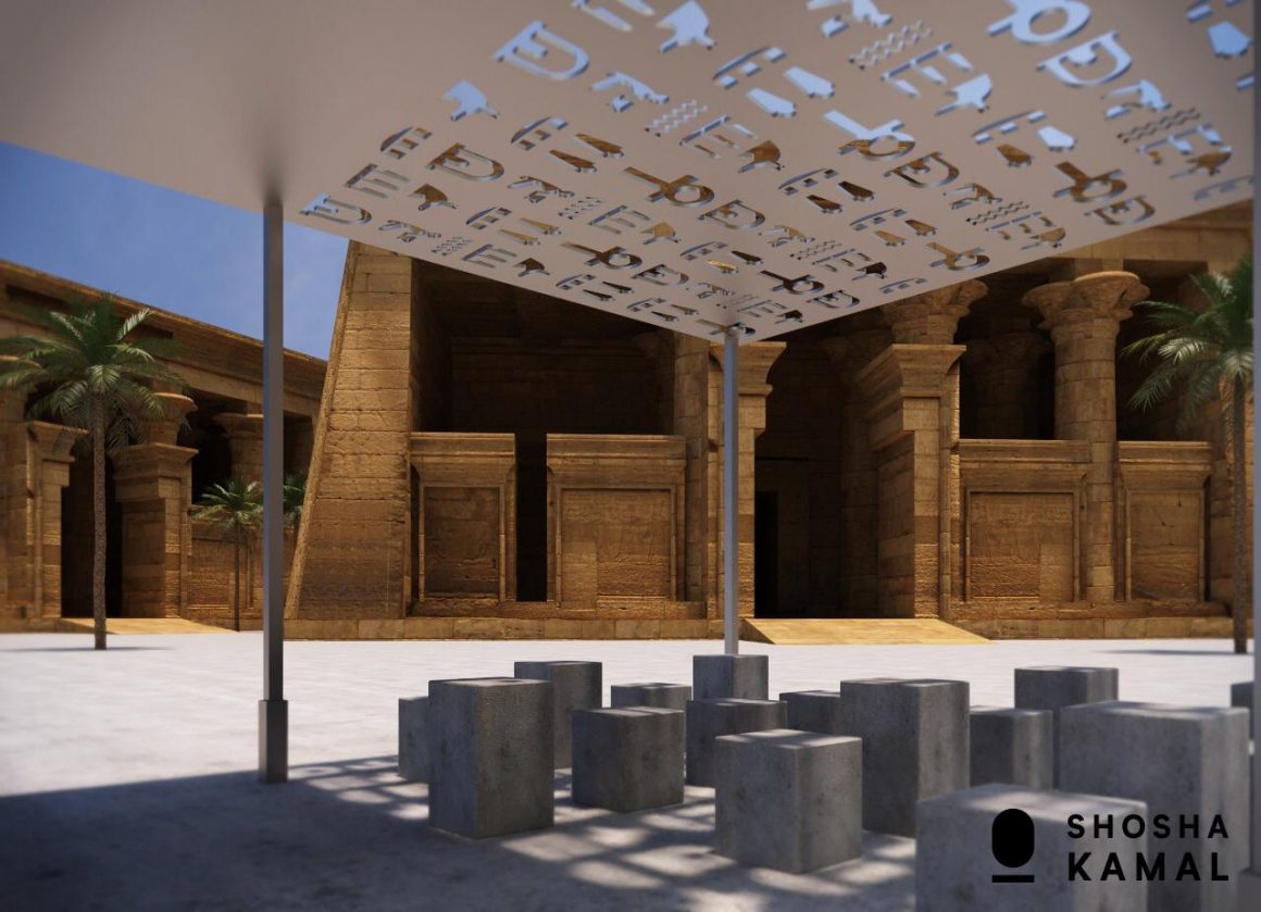 على هذا النهج قررت المصممة شوشة كمال، تطوير الخدمات بمعبد فيلة في محافظة أسوان، فنفذت مظلة محفورة بكلمات اللغة الهيروغليفية، بحيث يستطيع الزائر قراءة تاريخ المكان الأثري من خلال أشعة الشمس.