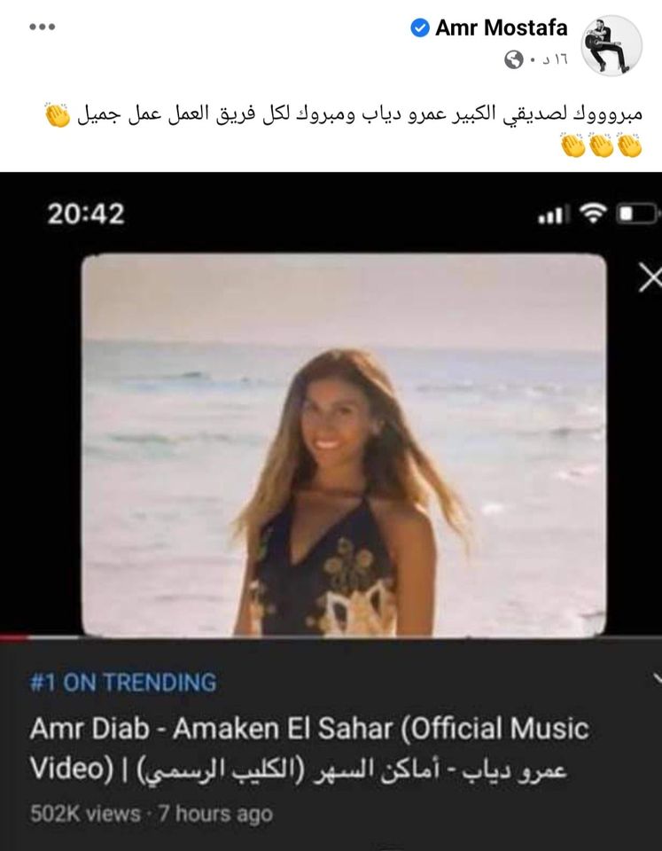 وبعدها بدقائق، نشر «مصطفى»، تهنئة جديدة، ولكن هذه المرة للفنان عمرو دياب، الذي لحن «مصطفى» له عدة أغاني، على مدار سنوات، حقق فيهما الثنائي نجاحًا كاسحًا، قبل أن تنتهي علاقتهما الفنية مؤخرًا، وكتب «مصطفى» مهنئًا «الهضبة» بأغنيته الجديدة «أماكن السهر»، الذي طرحها بالأمس: «مبروك لصديقي الكبير عمرو دياب ومبروك لكل فريق العمل، عمل جميل».