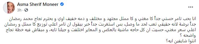 وقالت «أسما» عبر حسابها الرسمي على موقع التواصل الاجتماعي «فيس بوك»: «انا بحب تامر حسني جدًا كمغني وكممثل مجتهد ومختلف ودمه خفيف أوي، وبحترم نجاح محمد رمضان جدًا بردو لأنه حقيقي تعب لحد ما وصل، بس استغربت جدًا لما قرأت خبر بيقول أن تامر أعلي توزيع كممثل ورمضان أعلي سعر مغني».