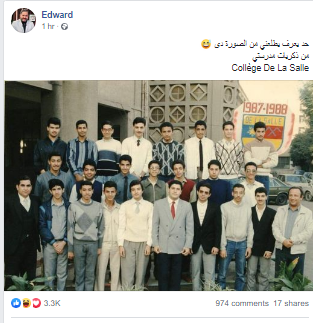 شارك الفنان، إدوارد، أحد أبرز الوسوم، الشائعة مؤخرًا عبر موقع التواصل الاجتماعي «فيس بوك»، بعنوان، تحدي صورتك في الدراسة، قائلًا: «من ذكريات مدرستي».