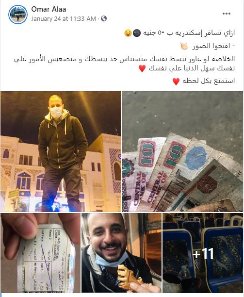 تداول رواد مواقع التواصل الاجتماعي في مصر، صورًا لشاب وثق رحلته الاقتصادية إلى الإسكندرية، في عدة صور، شجع من خلالها الآخرين على التغلب على عائق التكاليف المالية العالية التي تحول بينهم وبين السفر.