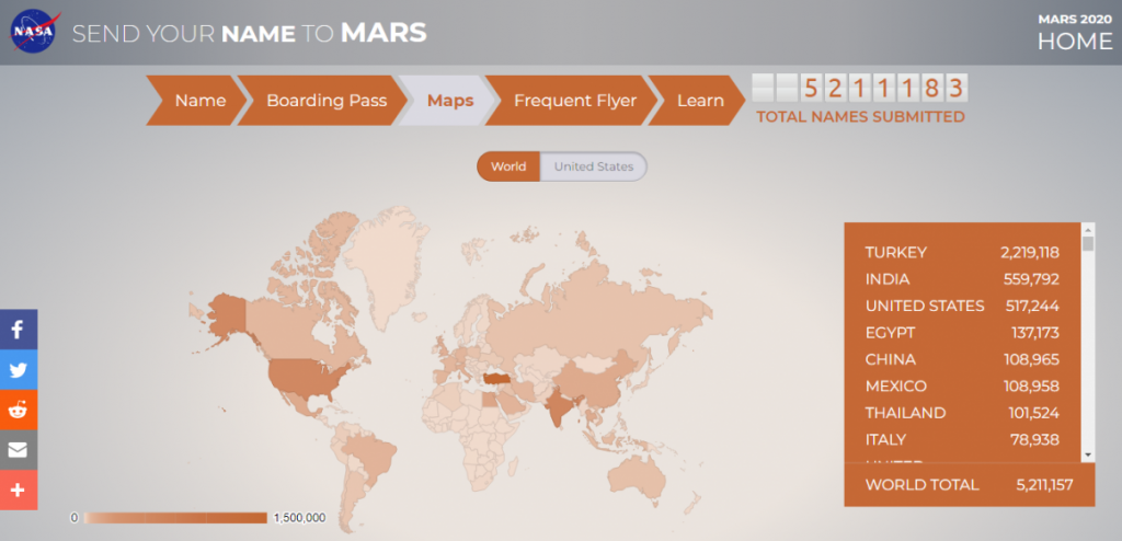في مايو من عام 2019، بدأت وكالة ناسا في إعداد رحلتها الأخيرة إلى كوكب المريخ، ولأغراض ترويجية، طرحت مبادرة لقيت تفاعلًا واسعًا في العالم أجمع، وهي «أرسل اسمك إلى المريخ»، بغرض تدوينها على رقائق إلكترونية، توضع على سطح الكوكب الأحمر عقب وصول المركبة الفضائية، ما يعني تخليد ذكرى طيبة لسكان الأرض.