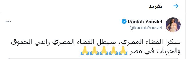 وغردت رانيا يوسف عبر حسابها الرسمي على موقع «تويتر» قائلة: «شكرا القضاء المصري، سيظل القضاء المصري راعي الحقوق والحريات في مصر».