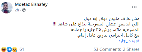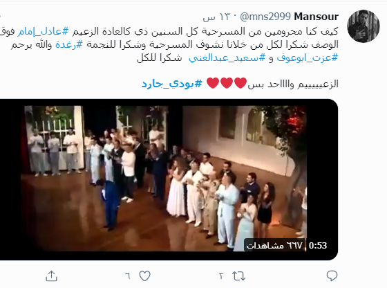 وكان لأحد النشطاء رأي مختلف حيث قال: «كيف كنا محرومين من المسرحية كل السنين ذي كالعادة الزعيم عادل إمام فوق الوصف شكرا لكل من خلانا نشوف المسرحية وشكرا للنجمة رغدة والله يرحم عزت ابوعوف وسعيد عبدالغني شكرا للكل».