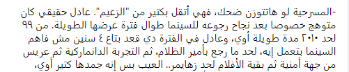 بينما أثنى آخر: «فيها ارتجال غير طبيعي من عادل إمام.. المسرحية دي بالتحديد هو تجاوز فيها محمد نجم وسمير غانم ملوك الارتجال، لدرجة أنك لو مسكت الأستوب وتش، وحسبتها، هاتلاقيه دخل في ساعة إلا ربع، بدون أي مبالغة، بيتكلم لوحده وماحدش بيرد عليه إطلاقا.. تحديدا في مشهد المحكمة!، المسرحية لو هاتتوزن ضحك، فهي أتقل بكتير من “الزعيم”. عادل حقيقي كان متوهج خصوصا بعد نجاح رجوعه للسينما طوال فترة عرضها الطويلة. من ٩٩ لحد ٢٠١٠ مدة طويلة أوي، وعادل في الفترة دي قعد بتاع ٤ سنين مش فاهم السينما بتعمل إيه، لحد ما رجع بأمير الظلام، ثم التجربة الدانماركية ثم عريس من جهة أمنية ثم بقية الأفلام لحد زهايمر.. العيب بس إنه جمدها كتير أوي، لدرجة إن هاتلاقي رغدة بتقوله: أنت كدا متحرش! فيرد عليها ويقولها: ليه فاكراني كلينتون؟!.. إفيه قديم بس مناسب لأحداث عصر عرض المسرحية ذاتها».