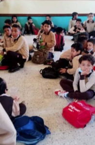 استقبل طلاب إحدى الصفوف الابتدائية، بمدرسة المثلث الابتدائية بالخانكة اليوم الدراسي الأول بالجلوس على الأرض، نتيجةً لعدم توافر المقاعد.