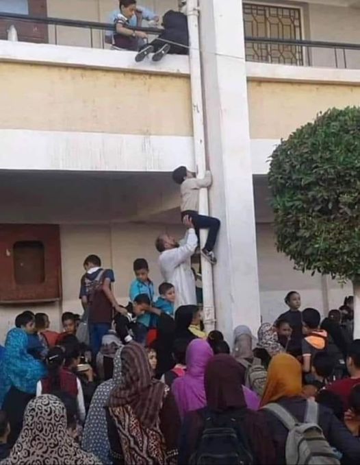 كما تداول رواد موقع التواصل الاجتماعي “فيسبوك” صورة لولي أمر يساعد ابنه في التسلق على أحد مواسير الصرف الصحي المتواجدة في المدرسة، ليكون أول من يصل إلى الفصل.