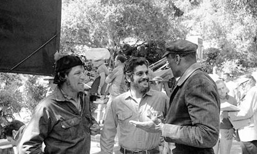 خلال لعبه لدور الثوري الكوبي تشي جيفارا، «الشريف» يأخذ استراحة من التصوير في هوليوود مع رودي دياز الشرطي السابق بلوس أنجلوس (على اليسار) ولاعب كرة القدم السابق، وودي سترود، وكلاهما لعبا أجزاء من فيلم Che’s guerilla band في عام 1969.