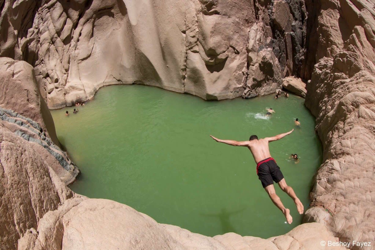 بعد الوصول إلى الطريق المؤدي إلى «حمام السباحة» الطبيعي كما يحب أن يلقبه مرتديه، يقوم المسافرون بالسير على الأقدام لمدة وجيزة ومن ثم يتسلقون بعض الصخور حتى عين المياه.