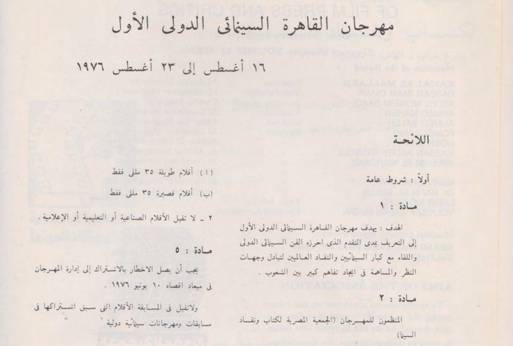 كذلك يستعرض الكتالوج لجنة اختيار الأفلام والتي ترأسها محمد الدسوقي، ومن بين أعضائها المخرج السينمائي صلاح أبوسيف، والناقد السينمائي الدكتور رفيق الصبان، وهو نفسه عضوا بهيئة التنظيم.