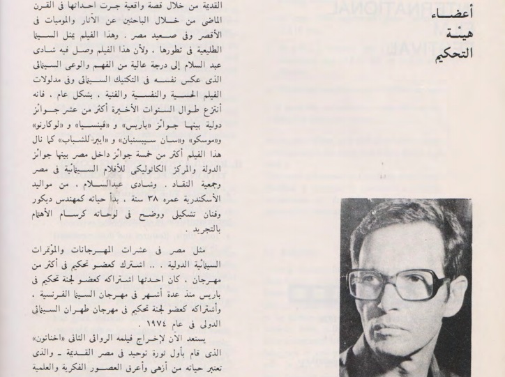 كان على رأس أعضاء هيئة التحكيم الدولية الخاصة بالمهرجان، الفنان الكبير شادي عبدالسلام، ممثلا عن مصر في دورة المهرجان الأولى، ونشر الكتالوج تعريفا في صفحة كاملة عن الفنان ذكر فيه أنه «يمثل السينما الطليعية في مصر»، هذه السينما التي بدأ طلائعها تتضح بجلاء في الستينيات على يده وعلى مجموعة من الشبان –وقتها- وقي مقدمتهم سعيد مرزوق، مخرج أفلام مثل «أريد حلا والمذنبون».