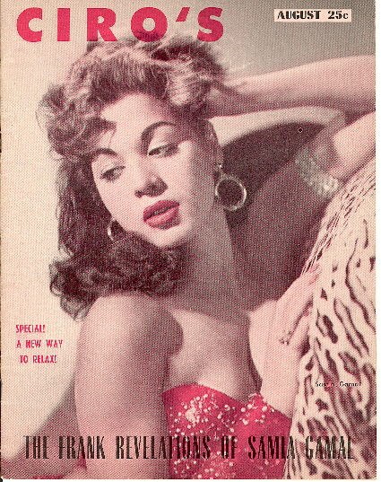 7. وضعت سامية جمال على غلاف دعاية لأحد الملاهي الليلية المعروفة في كاليفورنيا، وتحتها عنوان «الاكشتاف الحقيقي لسامية جمال»، وآخر جانبي «طريقة جديدة مميزة للاستجمام».