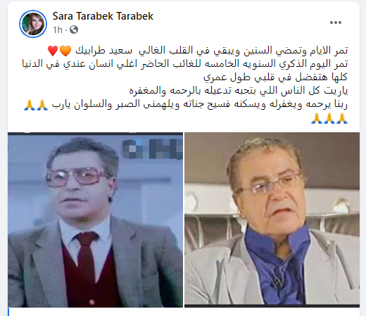 ونشرت سارة صورتين للراحل، عبر صفحتها الرسمية على موقع إنستجرام، من أجل إحياء ذكرى وفاة طرابيك الخامسة، ورثته بكلمات مؤثرة قالت فيها: «تمر الأيام وتمضي السنين ويبقي في القلب الغالي سعيد طرابيك، تمر اليوم الذكرى السنوية الخامسة للغائب الحاضر أغلى إنسان عندي في الدنيا كلها هتفضل في قلبي طول عمري».