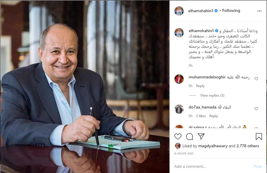 وفي الطريق إلى مسجد الشرطة، نشرت «إلهام» صورة للراحل، عبر حسابها الرسمي على موقع التواصل الاجتماعي «إنستجرام»، وكتبت معلقًا: «وداعًا أستاذنا المفكر والكاتب العبقرى وحيد حامد».