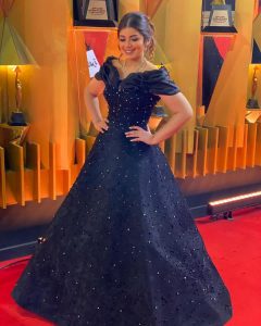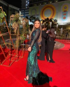 4- الفستان الأزرق الملكي لم يكن التعاون الأول بين بين ليلى زاهر و المصمم سامو هجرس، بينم اعتمدت من قبل وتحديدًا في حفل مجلة “دير جيست” فستان أسود من تصميم هجرس أيضًا. لم يبتعد ها التصميم كثيرًا عن فكرة الفستان المستقيم، لكنه تميز بقصة مختلفة للأكمام.