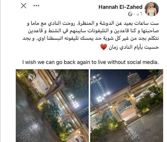 أما تعليقها على الأزمة نفسها، قالت «الزاهد»، عبر «تويتر»: « ست ساعات بعيد عن الدوشة والمنظرة، روحت النادي مع ماما وصاحبتها وكنا قاعدين والتليفونات سايبينهم في الشنط وقاعدين نتكلم بجد من غير كل شوية حد يمسك تليفونه اتبسطنا أوي، وبجد حسيت بأيام النادي زمان».