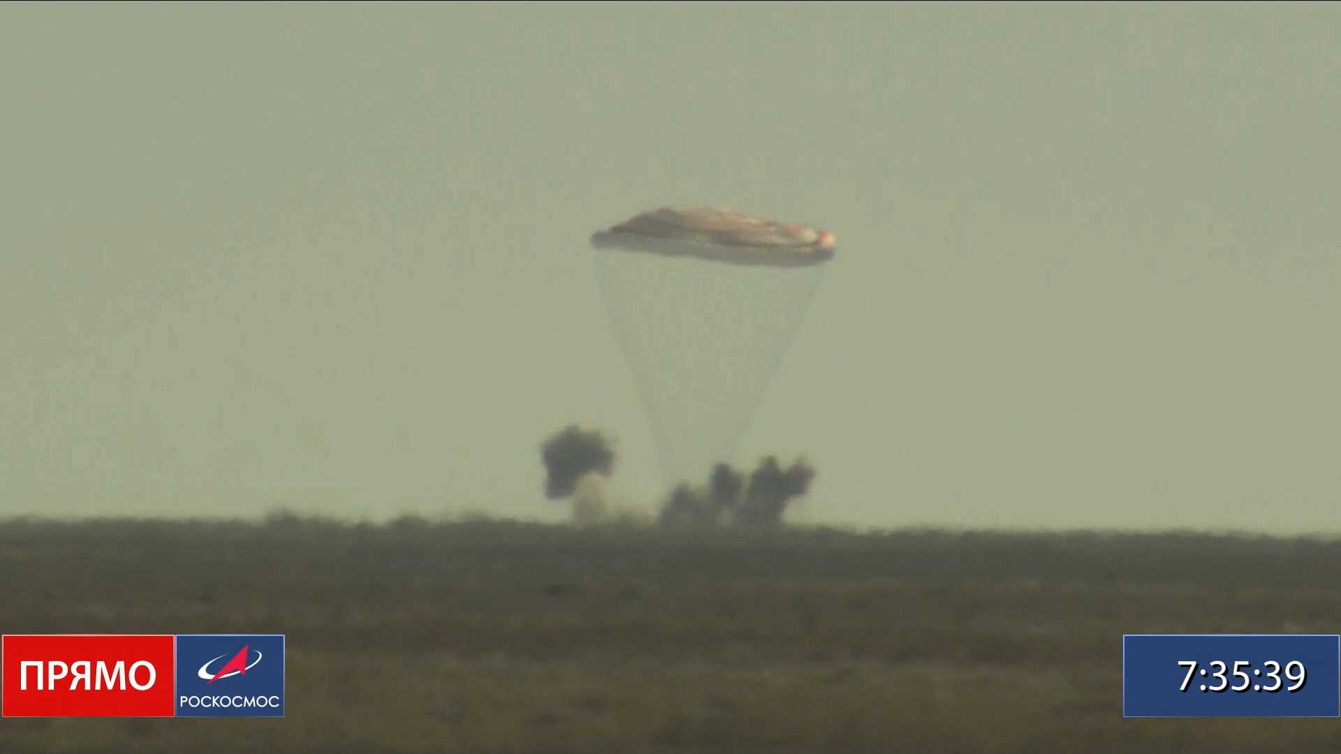 وفي لقطات حية بثتها وكالة الفضاء الروسية، حلقت طائرات هليكوبتر من فرق البحث والإنقاذ حول المنطقة التي كان من المقرر أن ينزل فيها رواد الفضاء، وحث مراقبو المهمة الطاقم على “الاستعداد” للهبوط. تحت مظلة كبيرة، هبطت الكبسولة، مرسلة سحابة من الغبار.