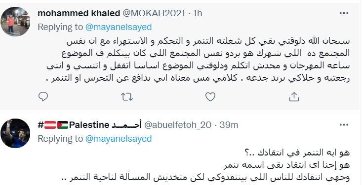 واتفق معه في الرأي حساب «أحمد فلسطين» متسائلًا: «هو إيه التنمر في انتقادك؟ هو إحنا أي انتقاد بقى اسمه تنمر!.. وجهي انتقادك للناس اللي بينتقدوكي لكن متخديش المسألة لناحية التنمر».