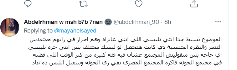 كتب حساب يحمل اسم «عبدالرحمن» في رده عليها: «الموضوع بسيط جدا انتي تلبسي اللي انتي عايزاه وهم أحرار في رأيهم، معتقدش التنمر والنظره الجنسية دي كانت هتحصل لو لبسك مختلف، بس انتي حره تلبسي أي حاجه بس متقوليش المجتمع عشان فيه فئة كبيرة من كتر الوقت اللي قضته في مجتمع الجونة فاكره المجتمع المصري بقى زي الجونة وبيتقبل اللبس ده عادي».