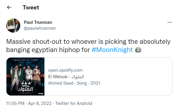 كما علق حساب يحمل اسم «Paul Truman»: «شكرًا لمن يختار موسيقى الهيب هوب المصرية الرائعة من أجل #MoonKnight».