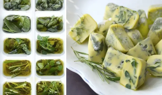 واحدة من أفضل الحيل التي توفر الوقت والجهد، هي وضع الأعشاب الطازجة داخل مكعبات الثلج، وإضافة القليل من زيت الزيتون عليها.