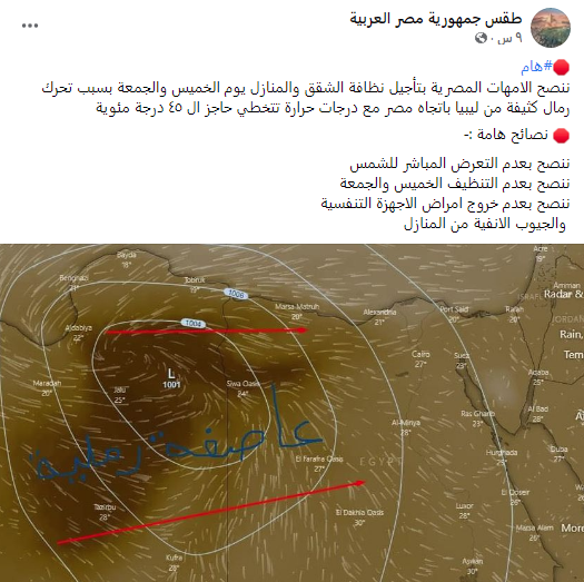 بالإضافة إلى تحذير آخر نصح بتأجيل التنظيفات لما بعد يومي الخميس والجمعة، «ننصح الأمهات المصرية بتأجيل نظافة الشقق والمنازل يوم الخميس والجمعة بسبب تحرك رمال كثيفة من ليبيا باتجاه مصر مع درجات حرارة تتخطي حاجز ال ٤٥ درجة مئوية».