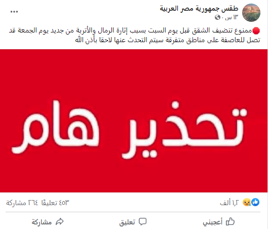 ذلك لأن البلاد ستشهد عاصفة من الرمال والأتربة، إذ تضمن محتوي التحذير «ممنوع تنضيف الشقق قبل يوم السبت بسبب إثارة الرمال والأتربة من جديد يوم الجمعة قد تصل للعاصفة على مناطق متفرقة سيتم التحدث عنها لاحقا بإذن الله».
