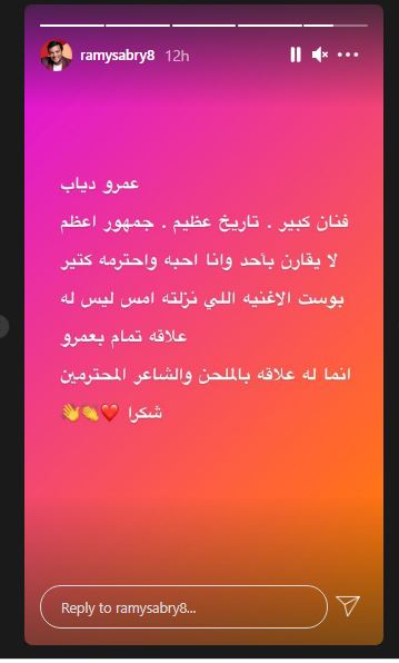وكتب رامي صبري: «عمرو دياب، فنان كبير، تاريخ عظيم، جمهور أعظم، لا يقارن بأحد، وأنا أحبه وأحترمه كتير».