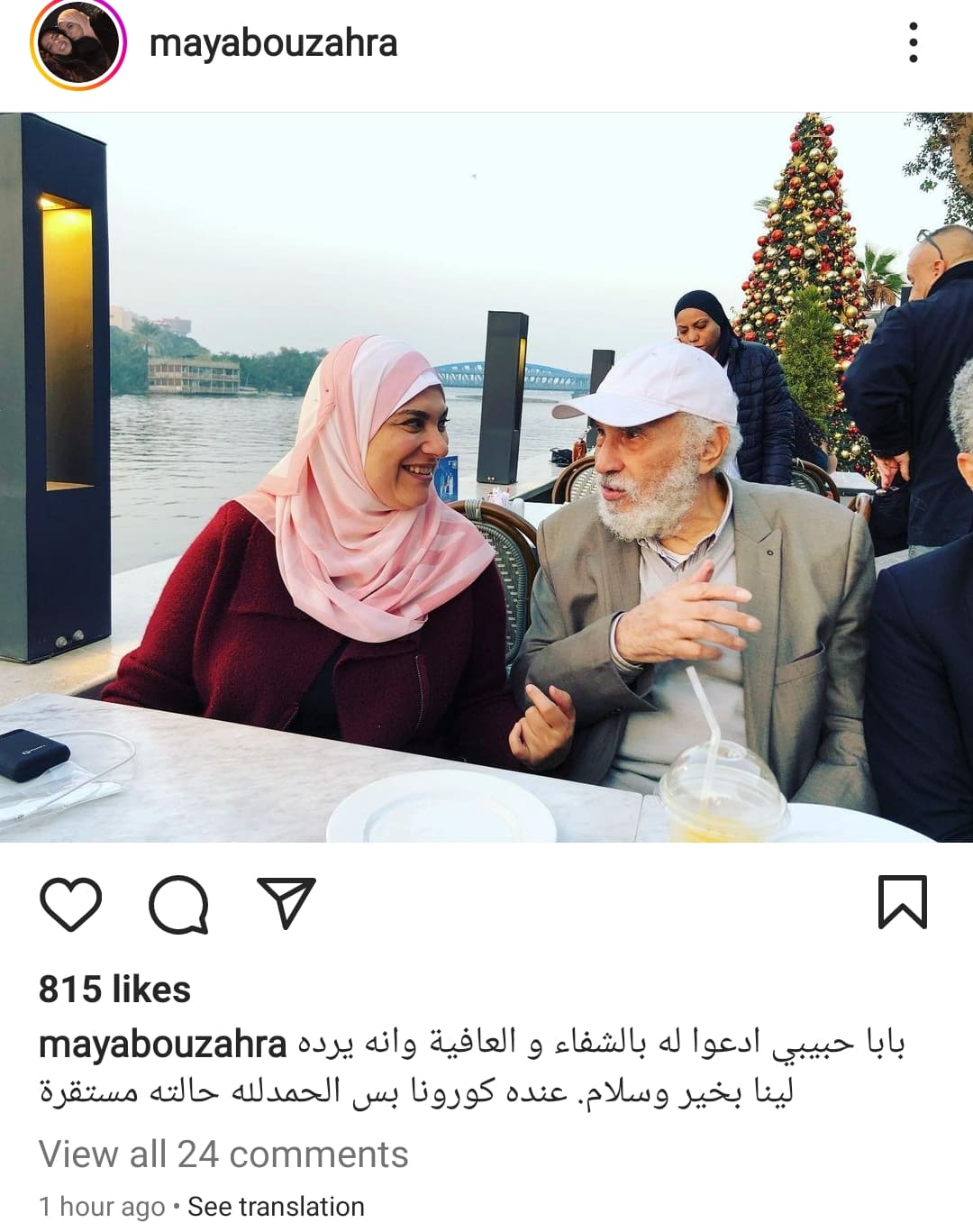 ونشرت مي عبر حسابها الشخصي عبر موقع إنستجرام، صورة جمعتها بوالدها، وكتبت عليها: «بابا حبيبي ادعوا له بالشفاء والعافية، وإنه يرده لينا بخير وسلام، عنده كورونا بس الحمدلله حالته مستقرة».